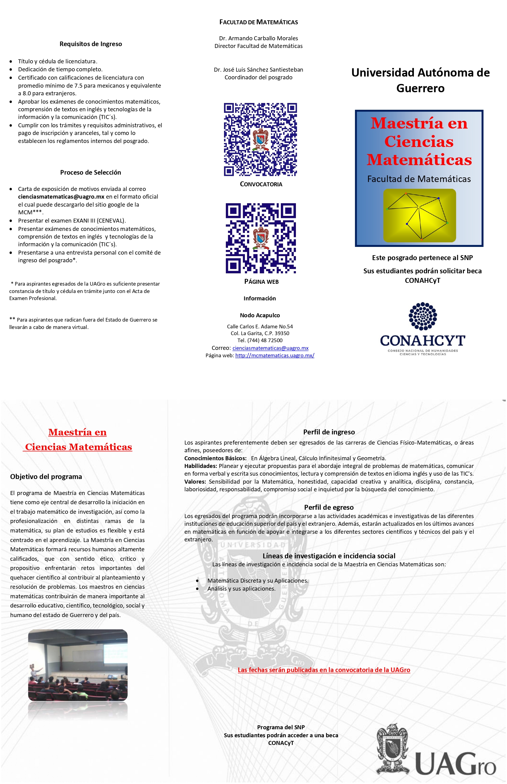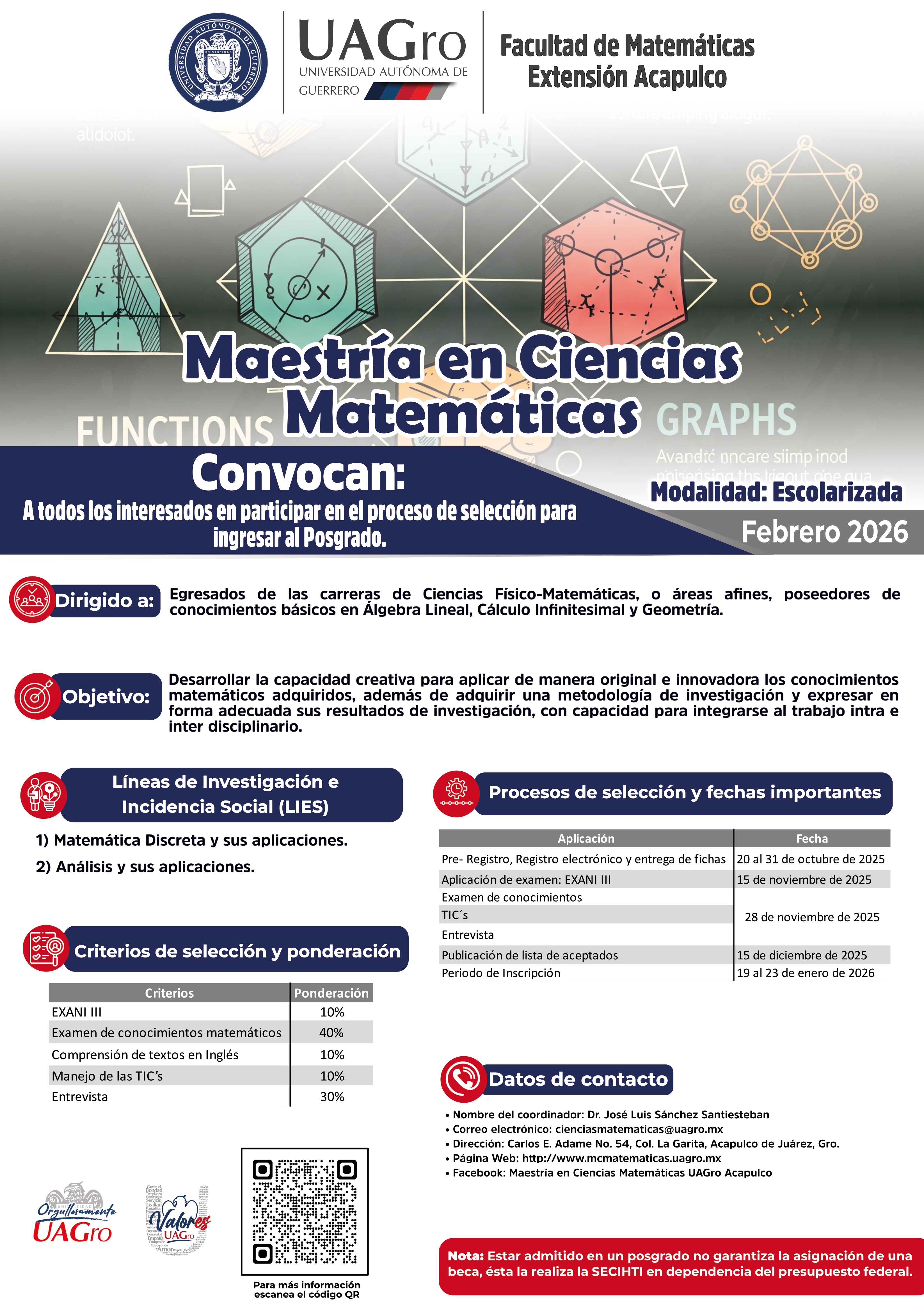 Los aspirantes que provengan de otras instituciones, que deseen ingresar o continuar los estudios de Maestría en Ciencias Matemáticas, podrán solicitar la revalidación o equivalencia de la unidades de aprendizaje de sus estudios por un máximo de cincuenta por ciento de los créditos del plan de estudios, siempre y cuando no hayan transcurrido más de cinco años desde la suspensión de sus estudios de acuerdo al RP (Título Quinto, Capítulo I, Artículo 66). La revalidación parcial o el establecimiento de equivalencias de estudios, serán determinados por el Consejo de Unidad Académica y validado por la Dirección de Administración Escolar y Certificación de Competencias, de conformidad con lo dispuesto en el RP. Las solicitudes de revalidación o establecimiento de equivalencias, no implican compromiso de admisión por parte de la Institución. Para los puntos no considerados en este apartado, será la Academia del Posgrado quien decida lo procedente, de acuerdo a los lineamientos del RP vigente.